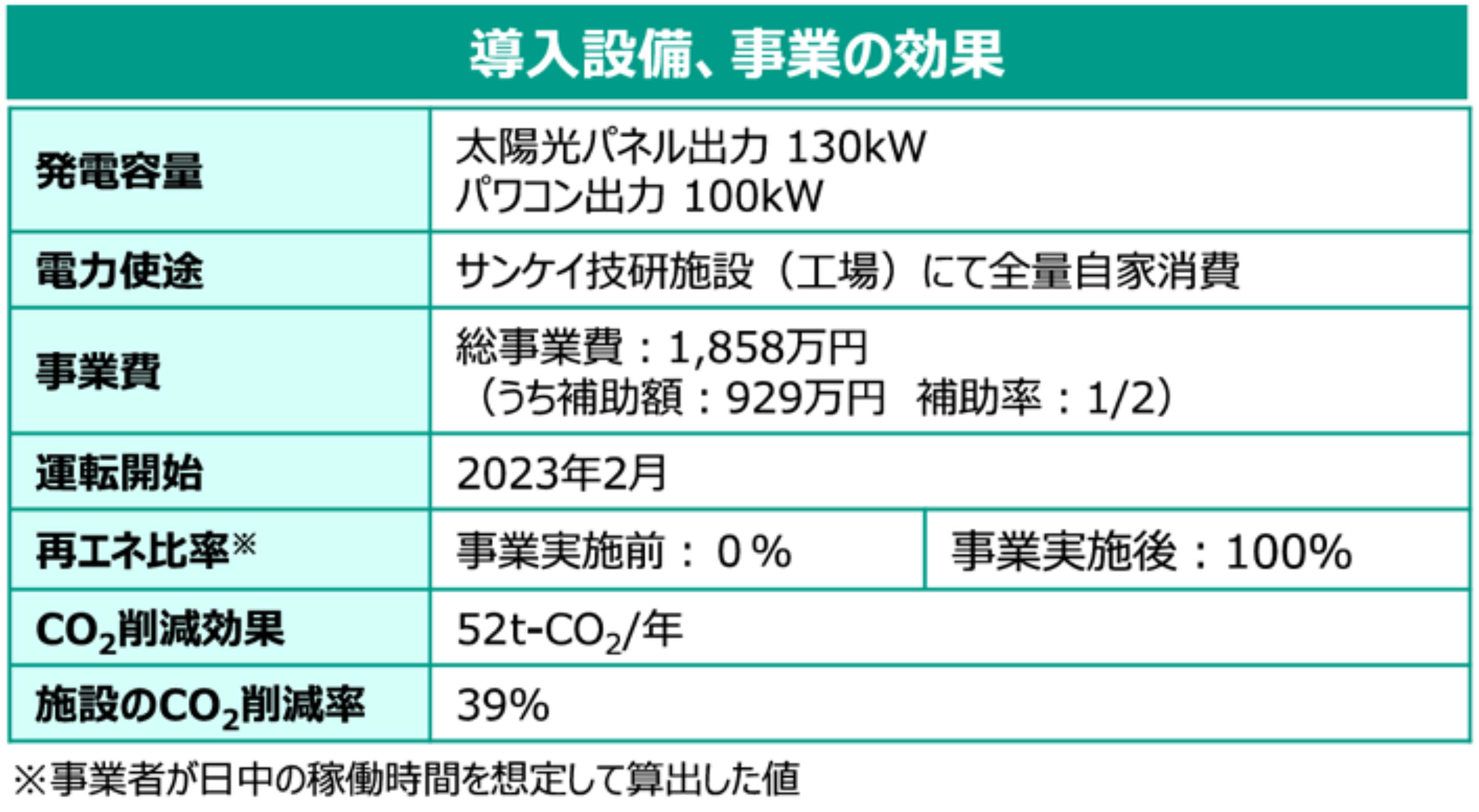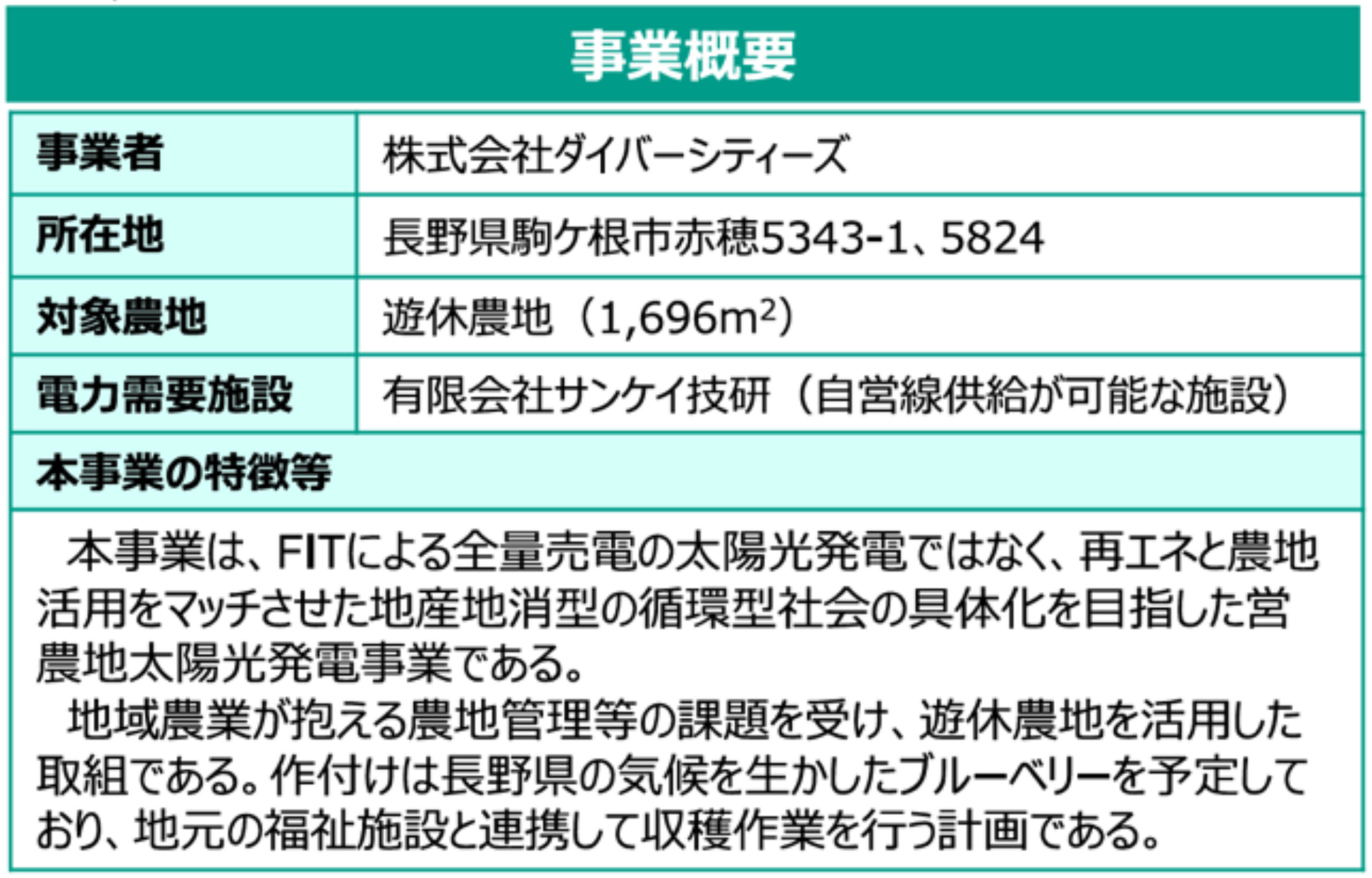 | 特徴 | 発電設備の設置場所が農業振興地域の農地であったため、営農型太陽光発電を行っている点。 |