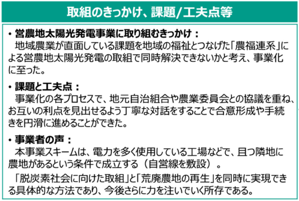 | 注意点 | 計画段階で農地法の関係と電力協議とを同時並行で行う必要がある。 |
